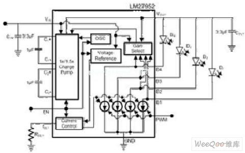 圖5:這個開關(guān)電容器白光LED驅(qū)動器可用于四個LED