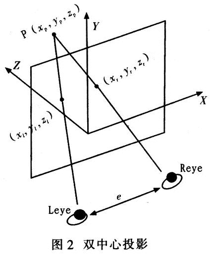 由以上研究可知,立體圖像對的產(chǎn)生是由于左、右眼觀察到的物體透視結(jié)果不同。因此在立體顯示的視景仿真中設(shè)置兩只虛擬的眼睛,一個獲取左眼的圖像,另一個獲取右眼的圖像,分別將左右眼的圖像傳送給相應(yīng)的眼睛。因此。在立體顯示中,需要采用包含兩個視點的透視投影方法一雙中心投影算法。圖2為雙中心投影。