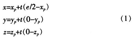 左視點Leye和右視點Reye均位于X軸上,兩視點間的距離為e,兩視點連線中心為坐標(biāo)原點,則左視點的坐標(biāo)為(-e/2,0,0),右視點的坐標(biāo)為(+e/2,0,0)。投影平面平行于XY平面,到左右視點的距離均為d。三維空間中一點P(xp,yp,zp)在左視點投影中的坐標(biāo)為(xl,yl,zl),在右視點投影中的坐標(biāo)為(xr,yr,zr),則zl=zr=d。點P(xp,yp,zp)和Reye投影線的參數(shù)方程為: