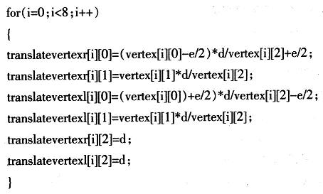 按上述投影算法計算出立體圖像對后,應(yīng)用OpenGL繪制立體圖像對,分別用紅、綠兩種顏色繪制右眼和左眼的圖像。以一個變長為10cm,中心點在原點的正方體為例,設(shè)兩視點間距離e為5cm,投影面距高觀察者d為40cm,考察正方體的一個頂點(5,5,5),由上述投影算法可得:xr=32cm,xl=48cm,yl=yr=4040cm,zr=zl=d=40cm對8個頂點分別計算后,連接相應(yīng)的立體透視投影點,即可得該立方體的立體圖像對。用數(shù)組vertex[8][3]存儲頂點,數(shù)組translatevertexr[8][3]存儲右眼投影計算后坐標(biāo),數(shù)組translatevertexl[8][3]存儲左眼投影計算后的坐標(biāo),對相應(yīng)的點進行投影計算: