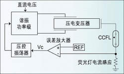 圖4給出了一個(gè)基于PZT的背景光轉(zhuǎn)換器的簡(jiǎn)化功能圖。PZT由一個(gè)幅度正比于輸入電壓的諧振功率級(jí)驅(qū)動(dòng),它提供驅(qū)動(dòng)熒光燈所需要的電壓增益。圍繞著誤差放大器形成了一個(gè)控制環(huán),誤差放大器把平均熒光燈電流同參考信號(hào)(REF)相比較,以便于對(duì)熒光燈的光強(qiáng)度進(jìn)行調(diào)節(jié)。控制電壓Vc驅(qū)動(dòng)用來(lái)確定諧振功率級(jí)的運(yùn)行頻率的壓控振蕩器(VCO)。
