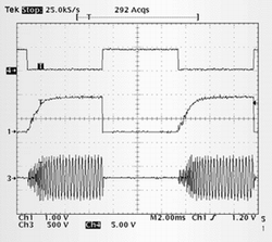 圖6顯示了基于壓電變壓器電路的脈沖調(diào)光波形。一個(gè)外部驅(qū)動(dòng)信號(hào)(曲線(xiàn)4)用來(lái)給定工作周期和脈沖串的頻率,在本例中,在50%的工作周期脈沖串的頻率為100Hz。曲線(xiàn)1是反饋網(wǎng)絡(luò)的COMP引腳的信號(hào),用來(lái)設(shè)定工作頻率。熒光燈電壓如曲線(xiàn)3所示。這些圖片是使用數(shù)字示波器得到,所以存在混迭現(xiàn)象。熒光燈的激發(fā)電壓幾乎檢測(cè)不到,因?yàn)闊粢呀?jīng)是熱的并從前面的脈沖串周期運(yùn)行過(guò)來(lái)。