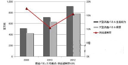 液晶面板的供求關(guān)系在2009年春季至2010年中期的1年多時間里,一直處于“供不應(yīng)求”及“供需平衡”狀態(tài)。但DisplaySearch預計,到2012年中國本土及外資企業(yè)的大量生產(chǎn)線“開始量產(chǎn)”時,整個FPD產(chǎn)業(yè)將“陷入供給過剩局面”。