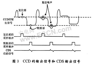 從圖3可以看出,當(dāng)復(fù)位部脈沖是高電平的時候。CCD的輸出信號進(jìn)行第1次采樣,采樣信號為復(fù)位電壓、復(fù)位失調(diào)電壓和復(fù)位噪聲;當(dāng)數(shù)據(jù)部脈沖是高電平時,CCD的輸出信號進(jìn)行第2次采樣,采樣信號除包括復(fù)位電壓、復(fù)位失調(diào)電壓和復(fù)位噪聲外,還包括有用的視頻信號。