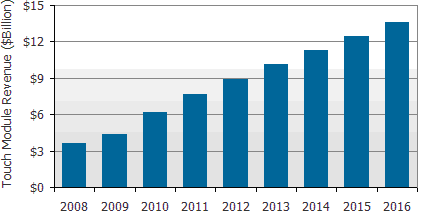 - DisplaySearch估計(jì)2016年觸控面板市場(chǎng)將成長(zhǎng)到140億美元