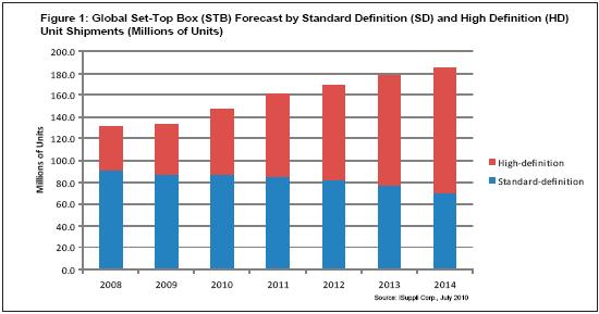 高清STB的出貨量最近幾年保持快速增長。2009年,高清STB出貨量增長600萬個以上,從2008年的3910萬個增長到4520萬個。到2012年,高清STB出貨量將首次超過標(biāo)清(SD)STB。到2014年,高清STB將達到1.14億個,復(fù)合年度增長率為20.3%。