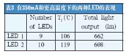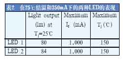 在數(shù)據(jù)表描述的25℃結(jié)溫和350mA的前向電流下,LED2的性能比LED1要好。但是,更實際的比較將在更高的結(jié)溫下進(jìn)行(見表3)。