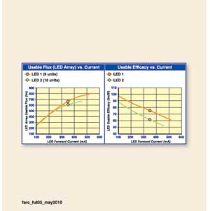 由于LED1的高熱/冷因數(shù),9個LED1的總光輸出比10個LED2高出50lm。盡管在25℃時,LED1的額定光通低于LED2,但在350mA的電流驅(qū)動下,其性能要超過LED2。圖3(左)顯示了LED1在任何前向電流的驅(qū)動下,都比LED2高出100mA。圖3(右)顯示了在同樣的電流驅(qū)動下,LED1的效能要高過LED2。