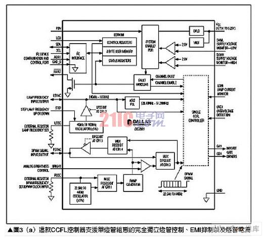 傳統(tǒng)上LCD面板使用CCFL燈管作為背光源,主要是這項技術(shù)擁有良好效率、低溫以及高照明能力等優(yōu)勢,雖然CCFL控制器在非汽車類應(yīng)用中,例如液晶電視或液晶顯示器上相當(dāng)成功,但汽車的工作環(huán)境卻對這項技術(shù)帶來特殊的挑戰(zhàn)與要求,為了讓元件數(shù)減少,CCFL控制器必須包含包括如EMI抑制、燈管電流過度驅(qū)動(overdrive)能力,以及將接腳數(shù)降到最低的串行控制接口、各信道燈管失效監(jiān)測、燈管頻率與DPWM控制用精確內(nèi)建振蕩電路以及其它功能等,這類解決方案有美信(Maxim)公司的DS3881,請參考圖3(a),其只需少許的外加電路,就能夠組合出完整的CCFL電源控制子系統(tǒng),請參考圖3(b)。DS3881主要針對汽車應(yīng)用環(huán)境進行最佳化設(shè)計,由于所采用的基礎(chǔ)電路組態(tài),因此外部晶體管、變壓器以及燈管本身就形成了EMI的噪聲來源,DS3881通過使用展頻與頻率偏移技術(shù)來降低EMI發(fā)射,并將任何未移除噪聲移到非關(guān)鍵頻帶來解決這個問題。