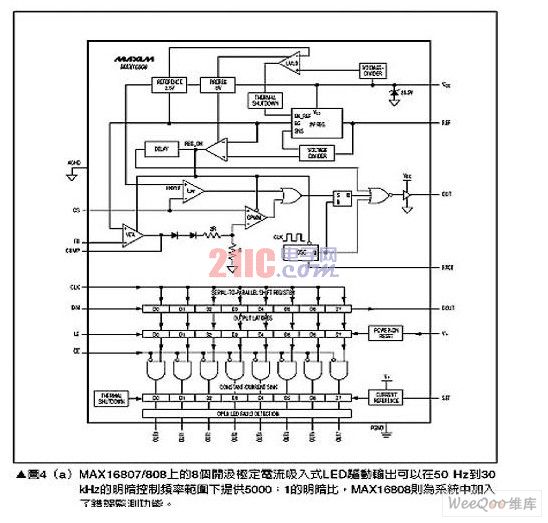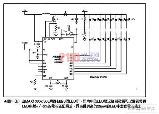 對于較小型的顯示面板,就可以使用LED矩陣來取代CCFL背光,不過使用多個LED串也會帶來相對的設(shè)計挑戰(zhàn),其中最明顯的是如何能夠在整個區(qū)域提供一致的照明與色彩輸出。推動LED背光矩陣的一個方式是采用內(nèi)含8個LED驅(qū)動通道,分別可以提供55mA電流輸出的MAX16807與MAX16808,請參考圖4(a),圖4(b)則顯示了采用MAX16807的典型電路如何簡化系統(tǒng),只需少數(shù)幾個元件就能夠完成背光驅(qū)動子系統(tǒng)的設(shè)計。
