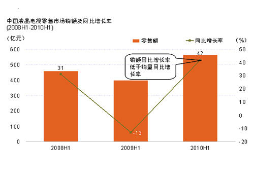根據(jù)捷孚凱(GfK 中國)全國液晶電視零售推算數(shù)據(jù),2010年上半年液晶電視市場整體規(guī)模為1517萬臺,同比2009年上半年規(guī)模增長55.2%,而銷售額同比增長42%。上半年度整體彩電市場規(guī)模為1863萬臺,液晶電視在整個(gè)彩電市場中的占比已經(jīng)達(dá)到82%。