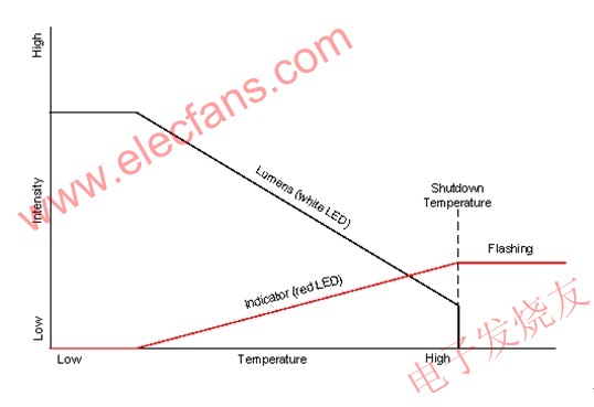 圖2所示系統(tǒng)中的流明下降是通過低功耗的紅色LED指示的。當(dāng)系統(tǒng)處于最大流明輸出時(shí),紅色LED關(guān)閉;當(dāng)LED燈溫度升高時(shí),流明輸出則會下降,而流明輸出下降時(shí),紅色LED即會開啟。隨著流明輸出不斷下降,紅色LED的強(qiáng)度會相應(yīng)增加。當(dāng)流明輸出下降到其最低強(qiáng)度時(shí),紅色LED將會完全開啟。