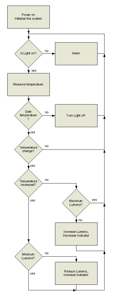 “警報(bào)”控制塊控制著溫度過高且LED燈被控制器關(guān)閉后的開關(guān)序列。接下來的“燈是否打開?”塊將再次開始檢測序列。退出報(bào)警條件的唯一途徑就是斷開并利用墻壁開關(guān)再次供電。