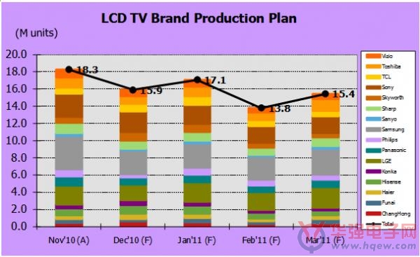包括全球品牌三星和中國本土品牌康佳在內(nèi)的前16家液晶電視品牌商每月生產(chǎn)總量已從2010年11月份的1千8百30萬臺(tái)降到了2011年3月份的1千5百40萬臺(tái)(如圖一)。同時(shí),2011年第一季度生產(chǎn)總量預(yù)計(jì)為4千6百30萬臺(tái),比2010年第四季度降低了12%。