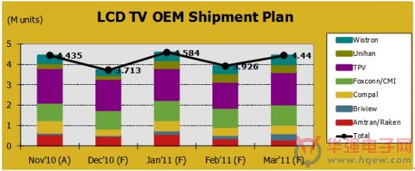 雖然電視品牌商對市場前景持謹(jǐn)慎態(tài)度,液晶電視代工廠商(OEM/ODM)卻在2010年12月份到2011年3月份期間持續(xù)增加每月出貨計(jì)劃。這個(gè)現(xiàn)象表明電視品牌商正在逐步增加生產(chǎn)外包到OEM/ODM廠商。而這主要是基于成本控管和生產(chǎn)規(guī)模的考慮。此外有些品牌商為了獲取所需的面板供應(yīng)也會(huì)增加釋單比率。