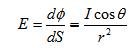 照度(Luminosity)指物體被照亮的程度,采用單位面積所接受的光通量來表示,表示單位為勒[克斯](Lux),即lm/m2。1勒[克斯]等于1流[明](lm)的光通量均勻分布于1m2面積上的光照度。LED陣列的照度是多個(gè)單個(gè)LED照度的線性疊加。因此只分析單個(gè)LED照度。通常LED所照射的目標(biāo)距離比LED本身大的多,在這種情況下將LED發(fā)光管簡化為一個(gè)有一定空間光強(qiáng)分布的點(diǎn)光源。點(diǎn)光源的特點(diǎn)是能以4立體角向周圍空間發(fā)出相同發(fā)光強(qiáng)度的光輻射。假設(shè)面元dS接受LED點(diǎn)光源S的光照,設(shè)點(diǎn)光源S至面元dS的距離為r,并且點(diǎn)光源發(fā)出的元光束的光軸與面元的法線N之間的夾角為,則面元上的照度為: