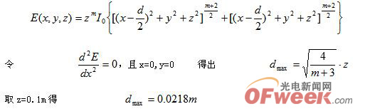 d增加到0.0218時(shí),原點(diǎn)附近的區(qū)域的光照度不至下降很多,此距離比較合適。通過仿真可以驗(yàn)證計(jì)算結(jié)果,如圖1所示,當(dāng)d=0.0218m時(shí),原點(diǎn)附近照度較均勻。 [page]