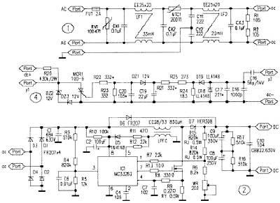 MC33262是一款可靠且成本低廉的功率因數(shù)校正芯片,其應用電路如圖2所示。市電經電源濾波器和整流器得到脈動直流電。電流通過啟動電阻R10向C2充電至10V時,IC1開始工作。整流后的直流脈動電壓在R5的分壓作為取樣信號經IC1的③腳輸入乘法器。直流輸出電壓在R6和WR上的分壓經①腳輸至誤差放大器的反相輸入端,與2.5V的參考電壓比較放大后輸出一個直流誤差電壓,同時也輸入到乘法器。