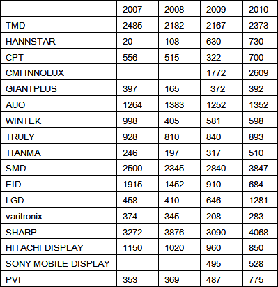 最后,中小顯示屏行業(yè)在一年內(nèi)也經(jīng)歷了比較大的變動(dòng)。華映(CPT)和彩晶(HANNSTAR)徹底轉(zhuǎn)型為中小顯示屏廠家。CPT在2010年出貨量高達(dá)3.52億片,比2009年增長135%;HANNSTAR在2010年出貨量高達(dá)2.48億片,比2009年增長505%。雖然出貨量大增,但是平均單價(jià)不高,毛利低。加上TFT-LCD生產(chǎn)線的高額折舊費(fèi)用,這兩個(gè)廠家還處于虧損的泥潭之中。