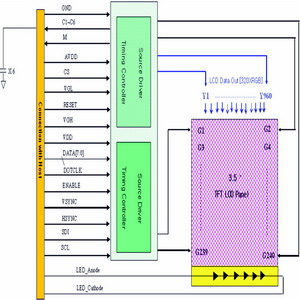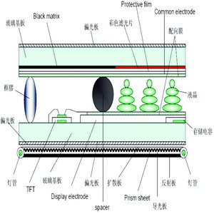 從TFT-LCD的切面結(jié)構(gòu)圖(圖1)可以看到LCD是由二層玻璃基板夾住液晶組成的,形成一個平行板電容器,通過嵌入在下玻璃基板上的TFT對這個電容器和內(nèi)置的存儲電容充電,維持每幅圖像所需要的電壓直到下一幅畫面更新。液晶的彩色都是透明的必須給LCD襯以白色的背光板上才能將五顏六色表達(dá)出來,而要使白色的背光板有反射就需要在四周加上白色燈光。因此在TFT-LCD的底部都組合了燈具,如CCFL或LED。
