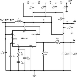 如今各種微型電壓升降壓芯片技術(shù)也日顯成熟,產(chǎn)品也在不斷增加,符合PMP/MP4、DSC、DV的TFT-LCD需要的,能同時(shí)多路輸出它們需要的不同電壓的集成電源管理芯片組(SOC)也在迅速推出之中。TFT-LCD顯示器系統(tǒng)需要多檔電源電壓,如PMP/MP4常用的三星3.5_和4_的TFT-LCD,它們的結(jié)構(gòu)如圖3所示,它們由TFT玻璃(TFTglass)、顏色濾波器(Colorfilter)、顯示區(qū)(Displayarea)、背光板和背光源(Backlight)四部分疊加組成。圖4是三星3.5_的TFT-LCD電路圖。它們的主要技術(shù)參數(shù)是:VIN=2.1-4.0V,VSW=15V/1.4A、VS=15V;用6個LED串聯(lián)做背光源,每個LED的VF=3.4V、IF=20mA,因此需要一個24V/50mA的電壓來驅(qū)動。常常選用帶電感的DC/DC來升壓,再加上倍壓電路,輸出多檔電源電壓滿足TFT-LCD的需要,如圖5所示。目前MP3、PMP/MP4、DSC、DV等的小尺寸TFT-LCD屏的低成本背光驅(qū)動方案常常是采用這種方法來設(shè)計(jì)實(shí)用電路的。