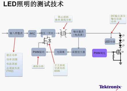 要達到高品質(zhì)的驅(qū)動電源設(shè)計標準,就需要進行全面的測試測量分析,如圖1所示,LED照明測試主要包括5個部分:電源質(zhì)量、諧波、功率開關(guān)器件測量、調(diào)制分析以及驅(qū)動輸出參數(shù)測試。