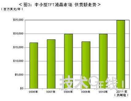 圖3表示中小型液晶市場過去5年內(nèi)的業(yè)績與今年的供貨額預測。手機及數(shù)碼相機等使用的中小型FPD因價格不斷降低,市場范圍逐步擴大,導致中小型液晶 市場的供貨額與供貨量增長幅度相比,持續(xù)出現(xiàn)了低增長,因2008年雷曼危機后消費低迷,這一市場陷入了供貨額大幅減少的局面。在此期間,許多中小型液晶 廠商都有過力圖通過縮小業(yè)務而生存下去的辛酸經(jīng)歷,包括同行業(yè)廠商間的業(yè)務撤銷與合并以及淘汰設備等。