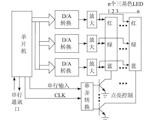 如圖2 中,87LPC762 單片機傳送數(shù)據(jù)到三路D /A 轉(zhuǎn)換器,將數(shù)字量轉(zhuǎn)換為模擬量,經(jīng)功率放大電路分別控制紅、綠、藍三色LED 發(fā)光的強度,從而控制LED 發(fā)光的顏色以及亮度, 對于多個LED采用動態(tài)掃描的方式,由單片機控制兩個輸出端子以CLK 為基準(zhǔn)輸出串行信號,經(jīng)串并轉(zhuǎn)換器件控制處于開關(guān)工作的三極管分別對三基色LED 進行點亮,完成對圖形圖案的控制。最后,此系統(tǒng)即可完成調(diào)光所需的各項功能。串行通訊接口采用RS232標(biāo)準(zhǔn)總線與計算機連接,可將計算機中需要顯示的圖案或文字傳送到本系統(tǒng)并顯示出來。