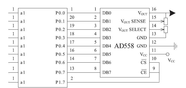 圖3 中AD558 是D /A 轉(zhuǎn)換芯片,能將數(shù)字量轉(zhuǎn)換為模擬量。單片機通過P0 口與AD558 的DB0 -DB7 連接,進行并行數(shù)據(jù)傳輸,以此控制AD558 輸出電壓的高低,輸出電壓通過功率放大控制LED 單色發(fā)光的強度。由于AD558 是8 位的D /A 轉(zhuǎn)換芯片,因此通過三路D /A 分別控制三基色時,其可將三基色中的紅、綠、藍分別分為28 = 256 份輸出,若將三基色任意組合即可最大形成2563 = 16777216 顏色和亮度的組合分辨率,通過軟件數(shù)據(jù)的設(shè)定可根據(jù)實際需要設(shè)置最大限度內(nèi)任意所需要的分辨率值。