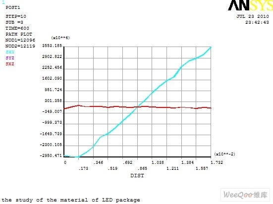 圖10 顯示了路徑上剪應力的變化情況,SYZ 與SXZ 幾乎重合,且剪應力很小,變化平緩;SXY 變化非常劇烈,說明在Y 方向上,即基板與熱沉之間有較大的剪應力,且由中間向兩端增大,表明剪應力主要集中在邊角區(qū)域。這是由于基板與熱沉為兩種不同的材料,材料之間的熱膨脹系數(shù)及彈性模量不同而產生較大剪應力。