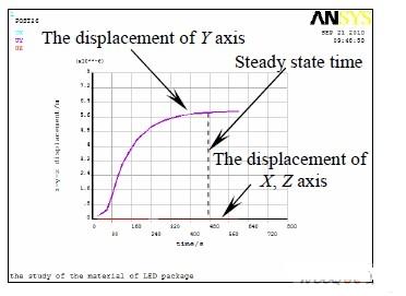 芯片頂面中心節(jié)點的位移隨時間變化曲線如圖7 所示,X 和Z 方向位移近似為零,Y 方向的位移隨著時間和溫度場的變化而不斷變化(Y 向為器件縱向即溫度傳遞方向),在光源點亮500 s 左右后,溫度場進入穩(wěn)定狀態(tài),此時芯片應變量達到最大6.3 μm,與瞬態(tài)溫度場的變化相符。