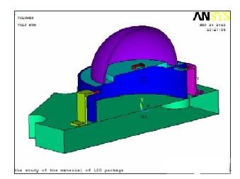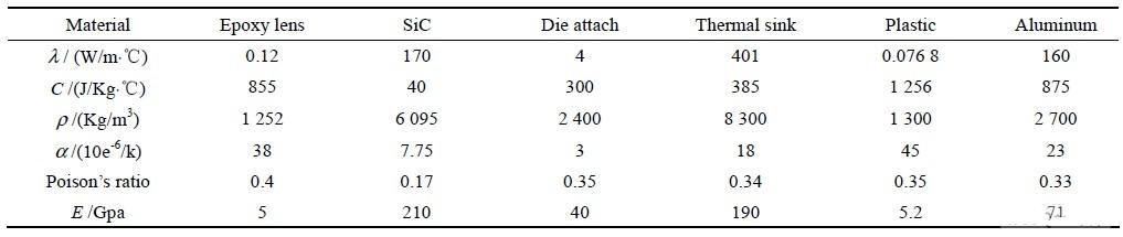 以Lumileds 的1 W 功率型LED 器件(如圖1)為研究對象,該LED 由透鏡、芯片、鍵合層、熱沉、基板及塑封料組成。熱量由芯片經鍵合層傳導到熱沉,最后由基板與空氣進行對流散熱。LED 各種封裝材料熱性能參數(shù)如表1 所示。