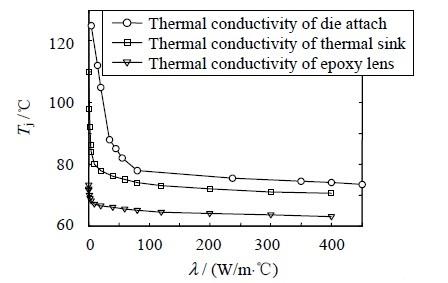 由圖可知,LED 結溫隨著熱沉和鍵合層導熱系數(shù)的變化趨勢類似,當λ 較小時,隨著λ 增大,結溫迅速降低;當λ 較大時,隨著各種材料導熱系數(shù)變化,結溫變化平緩。這是因為當λ 較小時,各材料的熱阻較大,而當λ 較大時,熱阻減小,熱量能順利傳出,此時導熱系數(shù)不再是影響整個系統(tǒng)傳熱效果的主要因素。由于LED 傳熱并不經過透鏡,所以透鏡的導熱系數(shù)對LED 的結溫變化影響很小。