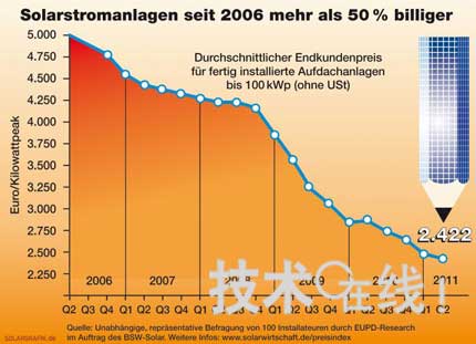 德國太陽能發(fā)電行業(yè)團(tuán)體BSW-Solar宣布,屋頂設(shè)置型太陽能發(fā)電系統(tǒng)2011年第一季度的零售價(包含安裝工程費)降到了2006年的一半以下。