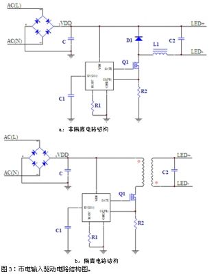 作為一種新型的節(jié)能、環(huán)保的綠色光源產(chǎn)品,LED擁有廣闊的市場(chǎng)前景。市場(chǎng)現(xiàn)階段已經(jīng)出現(xiàn)上千款LED驅(qū)動(dòng)IC。其中我們遇到比較多的是單芯片線路結(jié)構(gòu)(圖1a)。