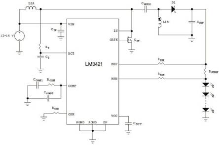 LM342x系列使用控制器集成電路實現(xiàn)所需功能和總體系統(tǒng)設(shè)計的最大靈活性。圖1以LM3421為例,顯示升壓配置中使用LM342x系列驅(qū)動LED燈組的一個示例。LM342x拓撲結(jié)構(gòu)的一個主要特點是在LED高側(cè)進行電流感應(yīng),允許燈組中的最后LED的陰極局部在底盤接地,并使感應(yīng)電壓可以差分地饋送回集成電路。這是一個重要的優(yōu)點,因為使LED燈組和驅(qū)動器集成電路可以彼此分離。