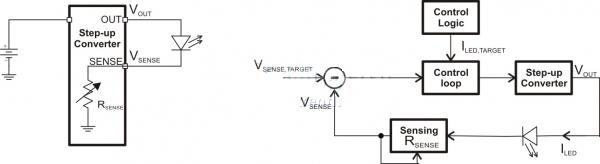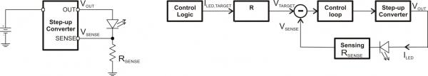 將閃光燈LED 與一個(gè)電流檢測電阻串聯(lián),然后通過一個(gè)升壓轉(zhuǎn)換器來驅(qū)動,這是一種簡單的方法。圖1 描述了這種方法。