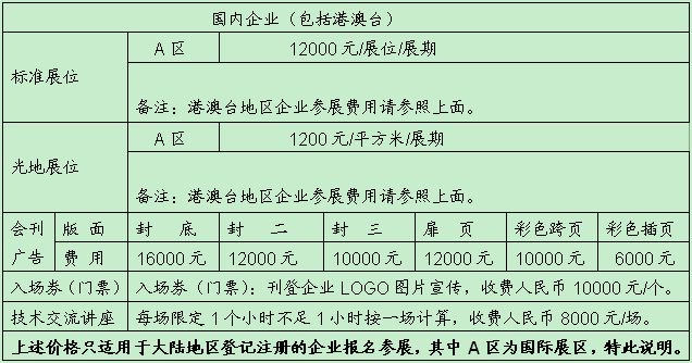 1、標準展位(3m×3m﹦9M2,配置:公司中英文楣牌、展出場地、展位地毯、三面2.5M高圍板、一張洽談桌、二把椅子、一個220V電源插座、兩支射燈。)