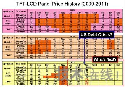 日本高級數(shù)據(jù)研究機(jī)構(gòu)首席執(zhí)行官高多清作就持這種觀點。2008年美國金融危機(jī)時,他對TFT-LCD面板價格做出了下降走勢的準(zhǔn)確判斷,因此,他對預(yù)計本次美國債務(wù)危機(jī)期間的TFT-LCD面板價格仍會繼續(xù)走低非常自信(見圖1)。