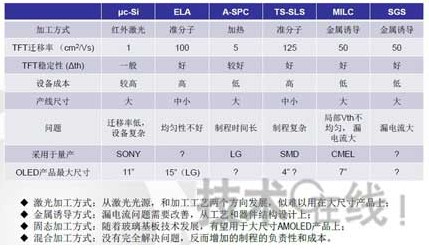 對于AMOLED顯示器對TFT背板的要求,京東方的未來技術(shù)研發(fā)總監(jiān)王剛表示,1.TFT載流子遷移率要高,以便在顯示周期內(nèi)為OLED單元提供足夠載流子注入;匹配OLED的電流效率。2.TFT穩(wěn)定性,TFT的開關(guān)特性不隨工作時間顯著變化,或在可控范圍內(nèi)變化,以保證從數(shù)據(jù)信號得到的顯示結(jié)果前后一致。3.TFT均勻性,在整個顯示矩陣上,TFT的開關(guān)特性趨于一致,減少因特性差異而增加的補(bǔ)償電路。還有,為將OLED用于柔性和透明顯示應(yīng)用,要求TFT背板的可撓性及透明化;底發(fā)射時為提高開口率要求TFT尺寸小。硅基TFT AMOLED技術(shù)比較如圖3所示。
