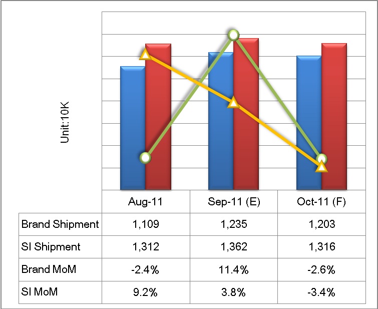 WitsView表示今年液晶顯示器年成長將呈現(xiàn)持平狀態(tài),全年預(yù)估出貨約為168M(臺)。另外,預(yù)估AIO出貨量約為12~12.5M左右,由于今年全球景氣受到歐洲債務(wù)危機(jī)延燒沖擊,整體市場規(guī)模有限,各品牌廠商截至目前為止出貨量距離全年目標(biāo)尚有一段距離,再加上歐美市場需求疲軟,因此各品牌廠商將集中于中國十一長假期間放手一搏,透過強(qiáng)力降價促銷以把握機(jī)會沖刺,以爭取全年市占率。