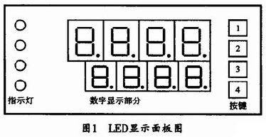 本文的LED通用智能型顯示面板如圖1所示。該面板中央為兩排LED數(shù)碼管,每排4位。上排為紅色,下排為綠色。面板左邊為四個(gè)發(fā)光二極管,右邊為四個(gè)按鍵開(kāi)關(guān)。其顯示和開(kāi)關(guān)可根據(jù)不同應(yīng)用定義。