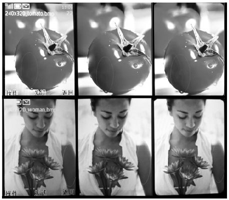 為了能更直觀地比較16bit、18bit 和24bit 的顯示效果差異,特地做了不同位深的手機(jī)顯示效果對(duì)比,從左到右分別為1,600 萬(wàn)色、26 萬(wàn)色和65,000色,如圖6 所示:在西紅柿的高光部分1,600 萬(wàn)色色彩過(guò)渡平滑、自然,看不到不均勻的顯示,26 萬(wàn)色的顯示效果稍遜,而65,000 色能明顯看出不均勻的顯示。