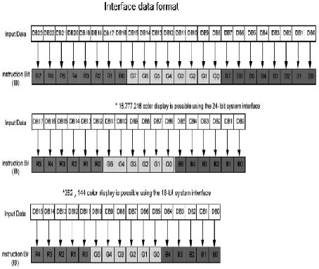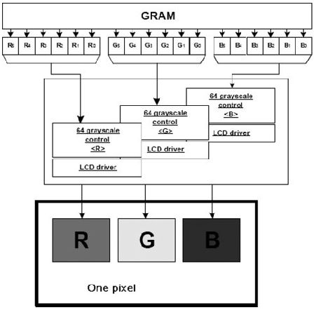 圖4 顯示了圖片的數(shù)據(jù)是怎樣實(shí)現(xiàn)灰階的。第一個(gè)是典型的24bit 顯示接口,數(shù)據(jù)通過(guò)GRAM 后轉(zhuǎn)換成8bit Red、8bit Green 和8bit Blue.同理,18bit 的顯示接口將數(shù)據(jù)轉(zhuǎn)換成RGB 666,16bit 的顯示接口將數(shù)據(jù)轉(zhuǎn)換成RGB 565,繼而混色成0到255 灰階的不同色彩。