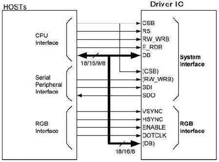 圖2 顯示了一個(gè)典型的主控端的連接方式,CS、RS、WRB、RDB 是控制型號(hào),分別是片選信號(hào)、數(shù)據(jù)或命令、寫(xiě)/ 讀信號(hào),按照一定的時(shí)序控制,數(shù)據(jù)得以傳輸,畫(huà)面才能正常顯示。