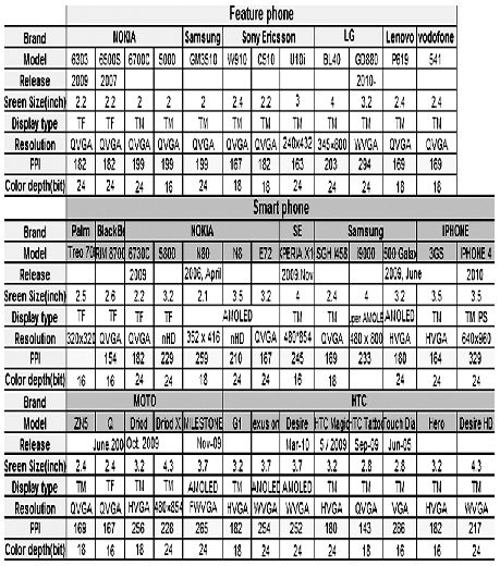 圖1 市面上常見(jiàn)手機(jī)的屏幕參數(shù)[page]