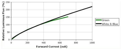由圖中可以看到,如果正向電流從350mA降低8.75倍到40mA,其相對發(fā)光強度將從100降低到20。降低將近5倍。顯然這是完全不能允許的。所以一定要把電流恒定。