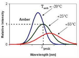而且當溫度變化時,LED的發(fā)光光譜也會發(fā)生變化。通常溫度增加時光譜的最大值是向波長長的方向漂移。大約是每升高10oC時漂移1nm,升高50度會產(chǎn)生5nm的變化(見圖6)。