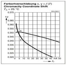 為了改變LED的亮度,最簡單的方法就是改變其正向電流。但是,正向電流的改變會引起光譜的改變,對于白光LED,會引起其視在色溫的改變,顯然這是不希望的(圖7)。