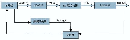 由于LED 的亮度與正向電流成正比,因此采用調(diào)節(jié)電流來改變亮度。通過調(diào)節(jié)電流來調(diào)節(jié)LED 亮度的方式有兩種: (1 ) 調(diào)節(jié)工作電流方式。(2 ) 脈寬調(diào)制(PWM)方式。